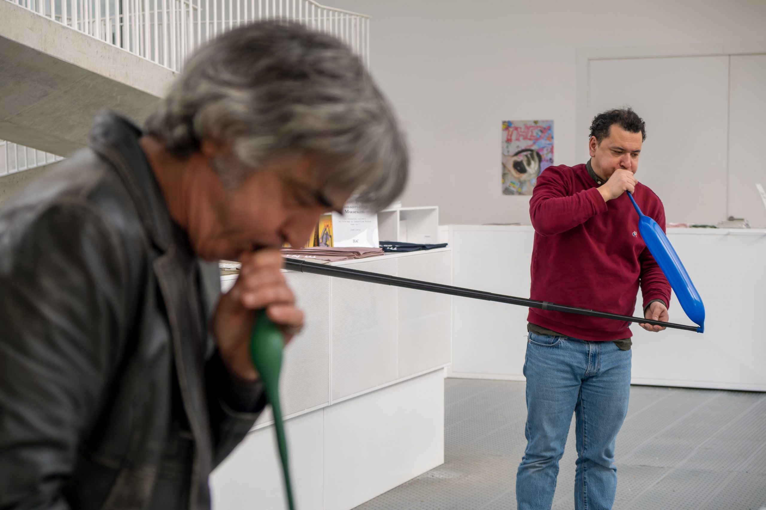 La faculté du duo à s’accorder à de multiples environnements l’incite à collaborer avec des artistes invités exerçant différentes disciplines (danse, musique, installations plastiques…)